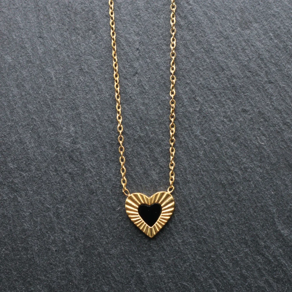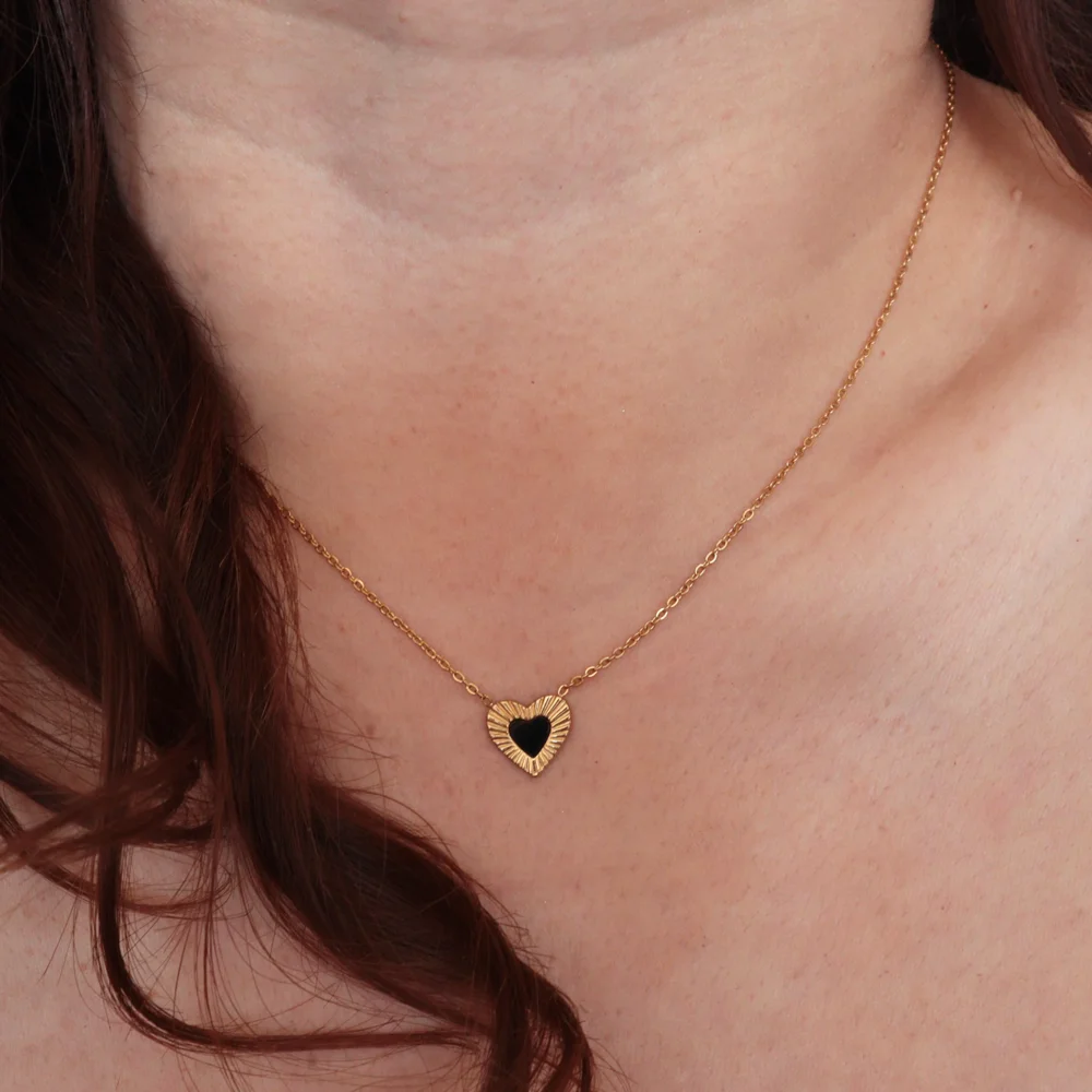 Un accesorio elegante y lleno de significado. Este delicado collar presenta un dije en forma de corazón, cuidadosamente enchapado en oro, con un corazón interior en tono negro que aporta contraste, estilo y sofisticación. Su diseño combina un acabado texturizado alrededor del borde, lo que crea un efecto luminoso y moderno.