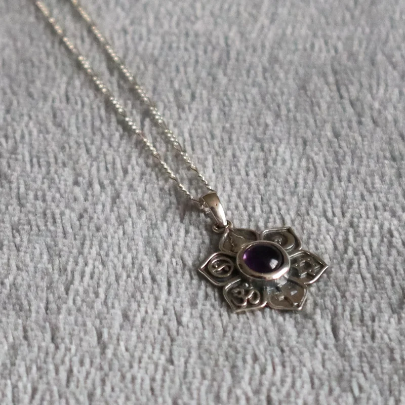 Este delicado collar de plata 925 presenta un elegante dije en forma de flor de loto, símbolo de pureza, renacimiento y belleza espiritual, acompañado por una brillante amatista natural, piedra conocida por su poder calmante y protector.