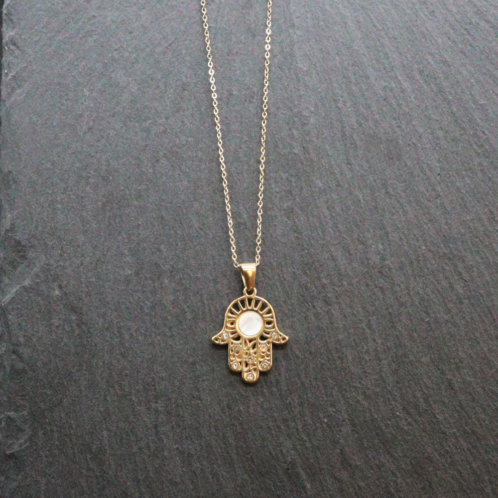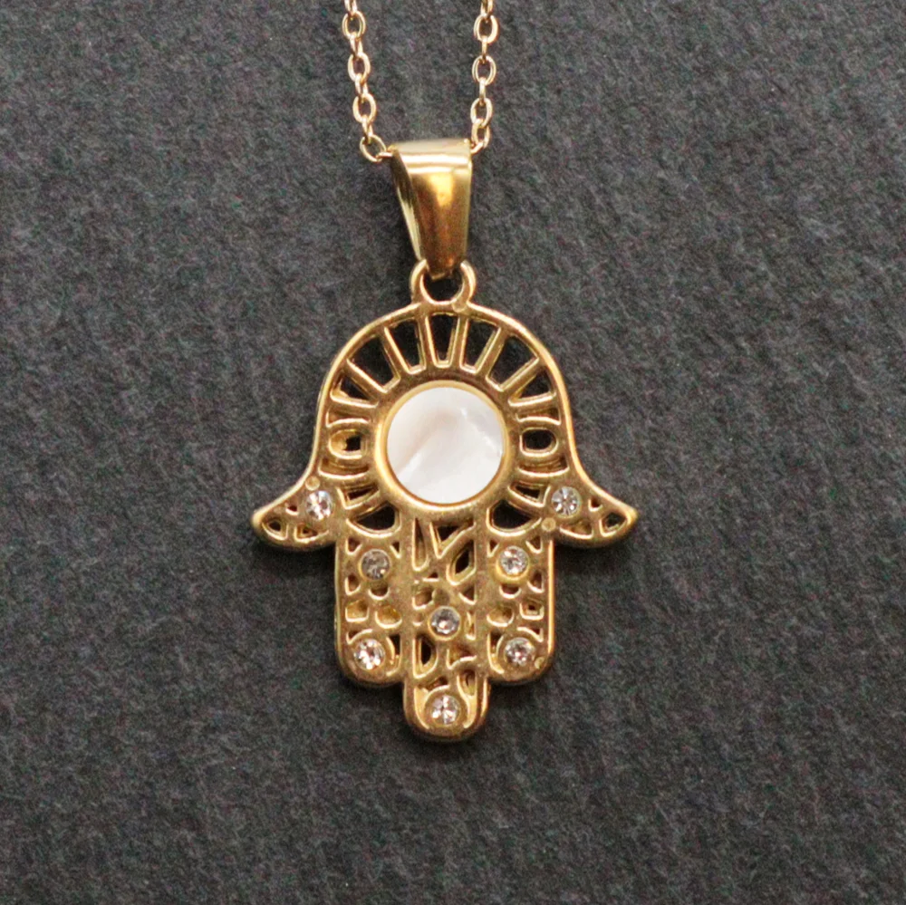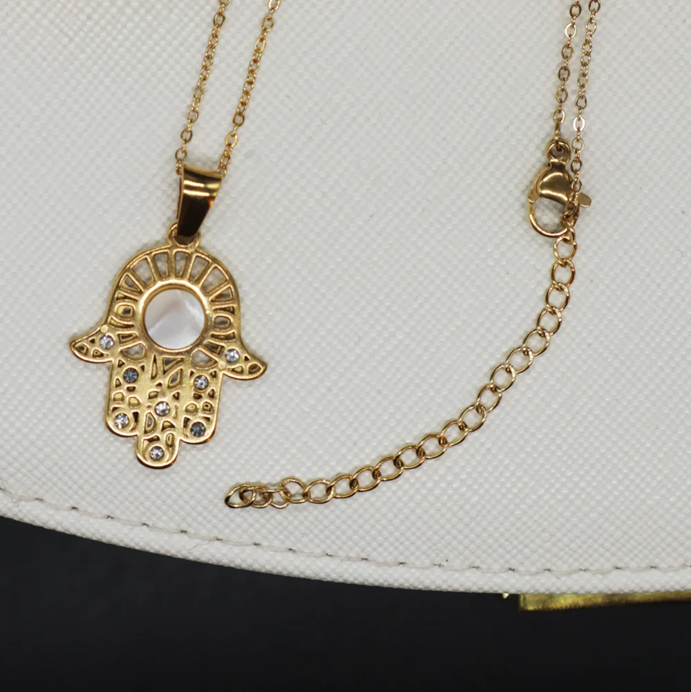 Luce un toque de simbolismo y elegancia con nuestro Collar Mano de Fátima Oro, un accesorio que combina significado, brillo y un diseño cuidadosamente trabajado. Su centro con detalle nacarado blanco aporta luz y delicadeza, mientras que la Mano de Fátima calada entrega un acabado moderno y lleno de personalidad.