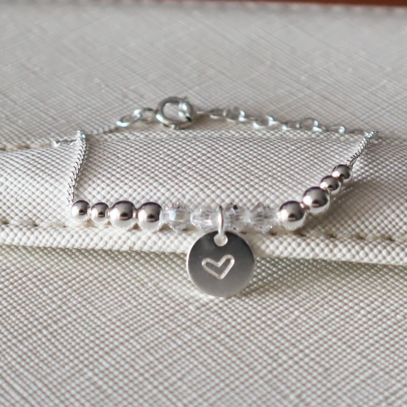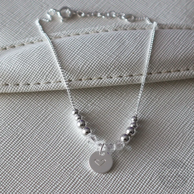 Esta encantadora pulsera combina el brillo sutil de los cristales con la suavidad de esferas metálicas y un delicado dije de corazón, todo ensamblado en una estructura armoniosa y femenina.